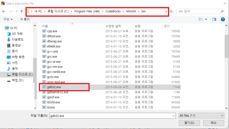 C:\Program Files (x86)\CodeBlocks\MinGW\bin 이 위치에 들어가면 gdb32.exe 또는 gdb.exe 가 있습니다.