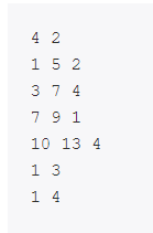 int main() { int gnum=1; int f_l; scanf("%d%d",&n,&q); for(int i=1;i<=n;i++) { scanf("%d %d %d",&Log[i].x1,&Log[i].x2,&Log[i].y); Log[i].num = i; } sort(Log+1,Log+n+1,cmp); //x1으로 정렬한다.