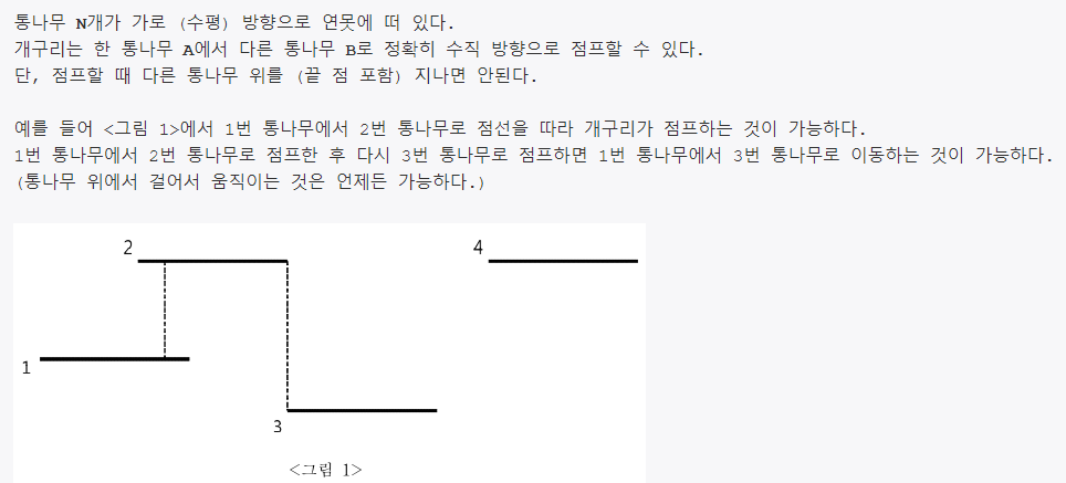 실제로 이 문제에서는 개구리가 y축으로는 어느 높이나 뛰어 올라 갈 수 있기 때문에 개구리가 점프 하지 않고 걸어가는 문제의 수직선 문제로 변환하면 생각하는 것이 단순화 됩니다.