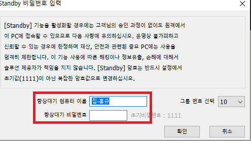 4. 위의 화면에서 Standby 를 체크하면 비밀번호를 입력하라고 나오면 1111 을 입력 합니다.