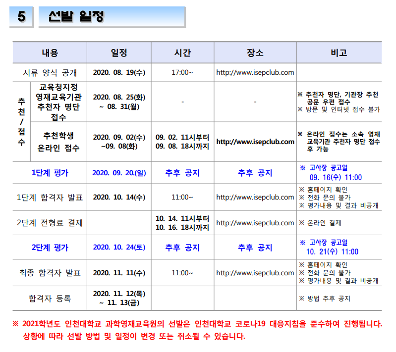 | 2021 서울교육대학교 과학영재원 신입생 모집 요강 (303) | 2020.08.31 |