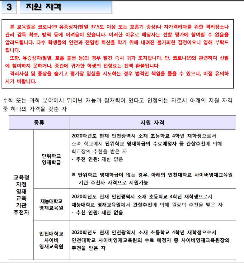 지원자격은 인천광역시 소재 초등학교 4학년 재학생 중 단위학교 영재학급의 수료 예정자 중 학교장의 추천을 받은 학생 또는 재능대학교 영재교육원 및 인천대학교 사이버 영재교육원의 수료자가 지원이 가능합니다.