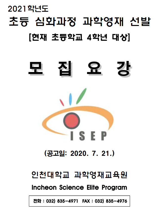 인천대학교 과학영재교육원에서는 지역의 우수한 과학영재를 발굴하여 교육하고자 2021학년도 초등과학영재 심화좌정 교육대상자를 모집합니다.