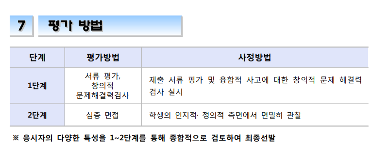 평가방법은 1단계에서 서류평가 및 융합적 사고에 대한 창의적 문제 해결력 검사 실시를 하게 되고