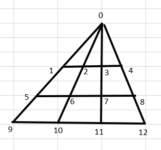 그 다음 9를 왼쪽에 포함하는 삼각형 - 3개,10을 왼쪽에 포함하는 삼각형 - 2개,11을 왼쪽에 포함하는 삼각형 1개 - 6개