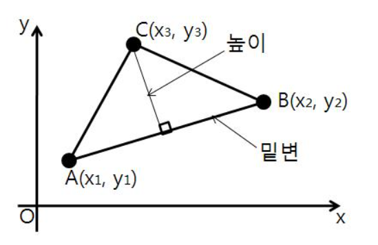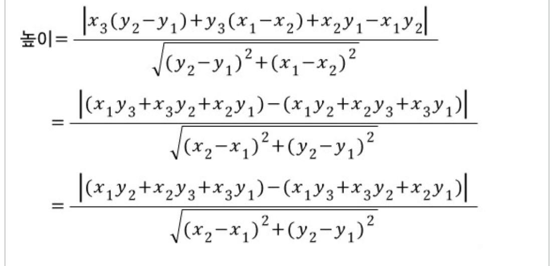 - 세 꼭지점의 좌표로 넓이를 구하는 방법 (기하 알고리즘에서 다각형의 넓이를 구하는 방법에서 자주 나오는 유형이다.)