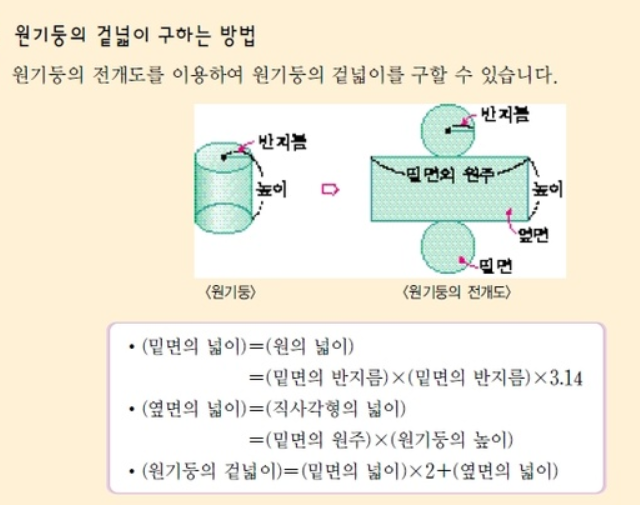 원기둥의 전개도를 확인하면 높이 * 밑면의 원주 와 밑면의 원과 위면의 원으로 이루어져 있음을 확인할 수 있습니다.