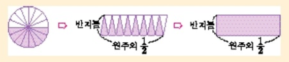 위의 그림과 같이 원을 잘게 잘라서 이어 붙인다고 하면 원의 둘레의 1/2 이 밑변이 되고 반지름이 높이인 직사각형을 만들 수 있는데요.