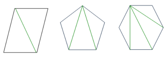 삼각형의 내각의 합이 180도가 되기 때문에 다각형을 위와 같이 삼각형으로 쪼갤 수 있는데 이렇게 쪼개 보면 n 각형은 n-2개의 삼각형으로 쪼갤수 있는것을 확인할 수 있다.