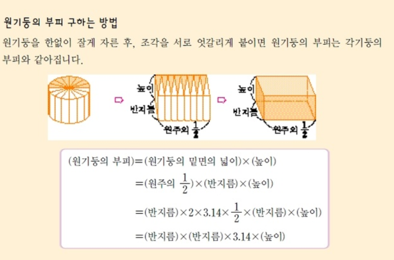 - 원기둥을 잘게 자른 후에 조각을 서로 엇갈리게 붙이면 원주의 1/2 , 반지름, 높이인 각기둥의 부피와 같아 지는 것을 확인 할 수 있습니다.