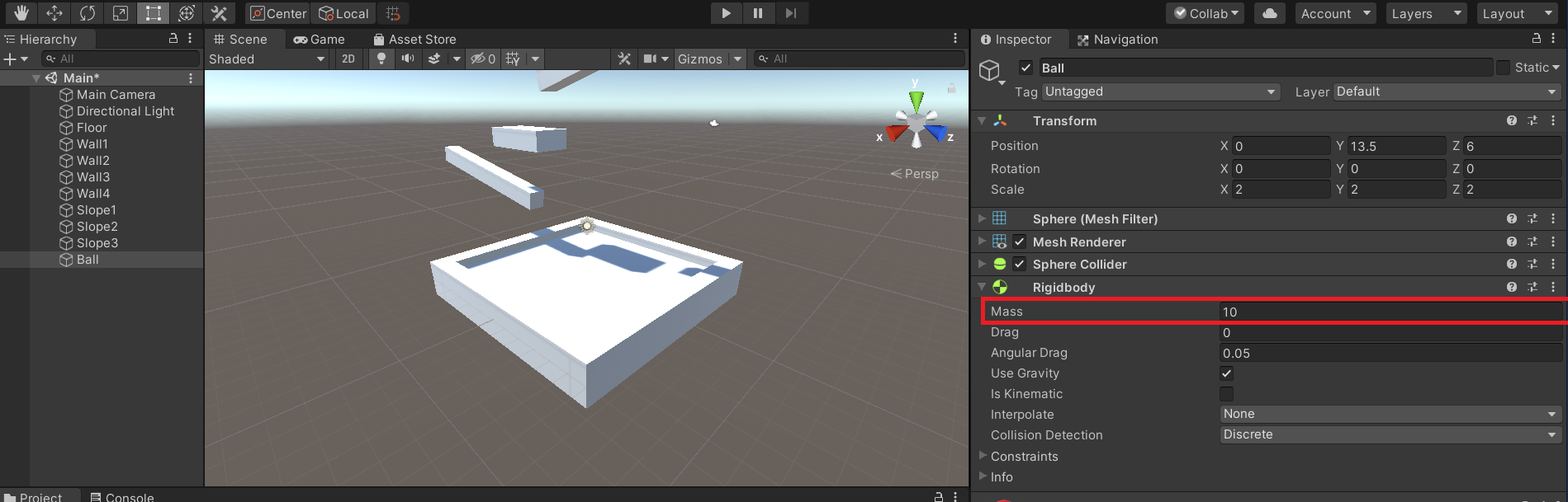 여기서 공의 속성값을 바꿔 보고 질량값을 바꾼후 실행을 해 보았습니다.