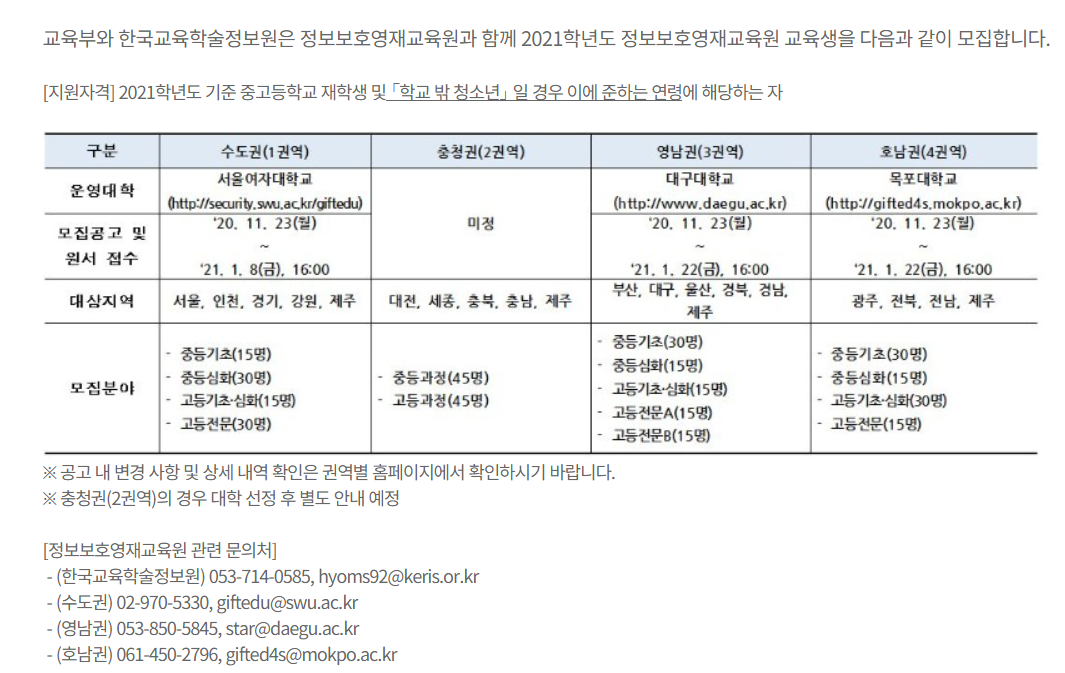 11월 23일 부터 21년 1월 8일까지 4개 권역으로 나누어서 정보보호영재교육원 교육생을 모집하고 있습니다.