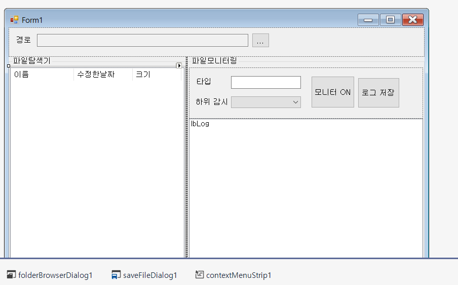 하단 : groupbox 2개,splitter 1개 , 왼쪽 groupbox 의 Dock 속성을 left, 오를쪽 groupbox 의 속성을 Client 로 설정