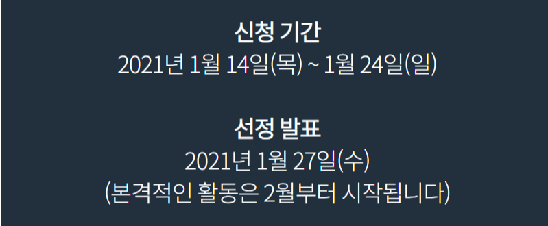 신청기간은 1월 14일(목)~1월 24일(일)까지이며 선정 발표는 1월 27일(수) 입니다.