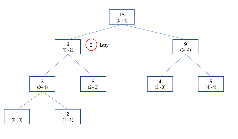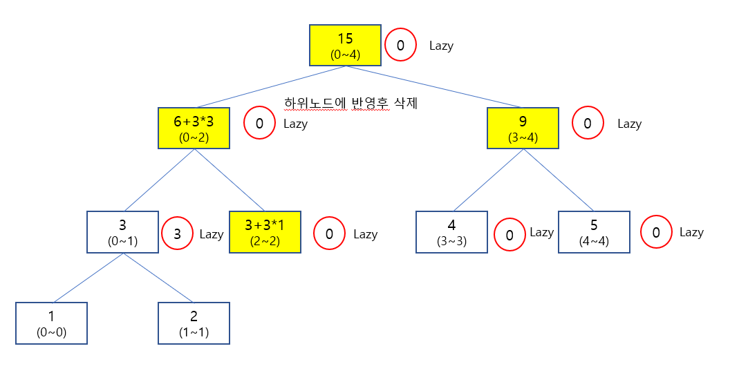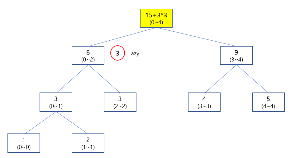 위와 같이 3의 Lazy 값을 셋팅 후에 나오면서 0~4 구간에 3 * 3 의 값을 셋팅 해 줄수가 있습니다.