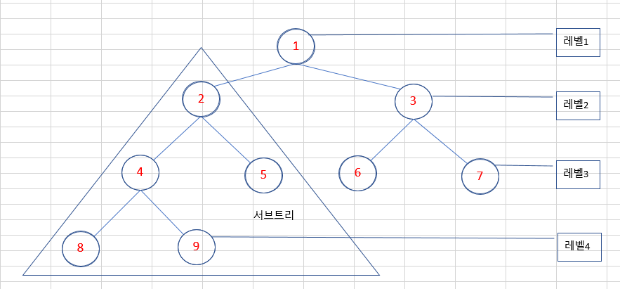 또한 임의의 노드를 선택하면 이 노드를 루트로 하는 트리구조가 되는데 이러한 구조를 서브트리(subtree)라고 하며, 루트노드에서 임의의 노드까지 방문한 노드의 수를 레벨이라고 하는데 위의 그림에서 루트를 레벨1로 시작해서 자식노드로 가면서 레벨이 하나씩 증가 됩니다.