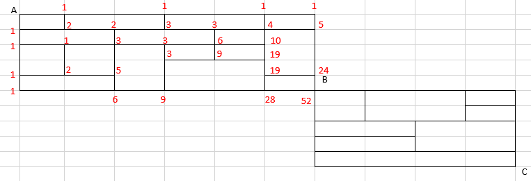 위와 같이 A에서 B로 가는 최단 경로의 경우의 수는 52 입니다.