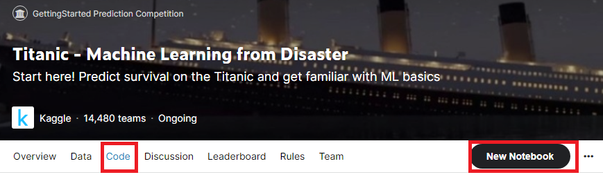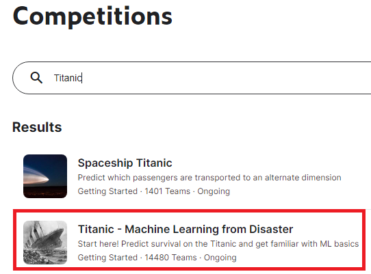 2. 검색창에 Titanic 이라고 검색한 뒤 Titanic:Machine Learning from Disaster 찾아 클릭