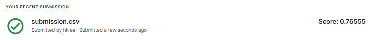 - 점수를 확인해 보면 0.76555 를 확인 할 수 있다.