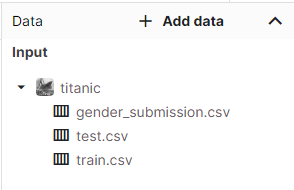 - Data 탭 : titanic 디렉터리 아래 gender_submission.csv,test.csv,train.csv 파일이 있다.