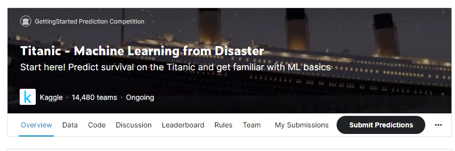 이 대회는 타이타닉호를 탄 승객들의 이름,성별,나이,지불한 운임,가족수 등 여러 정보를 주고 각 승객이 살았는지 죽었는지 예측하는 경진대회로 대회라기 보다는 튜토리얼 성격이 강하다.