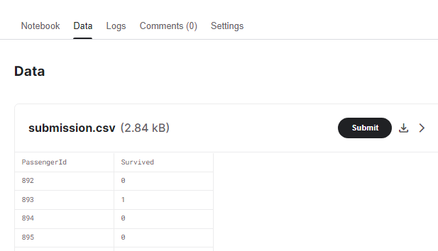- Data를 클릭하면 업로드 된 submission.csv 파일을 확인 할 수 있고 여기서 Submit 버튼을 클릭해서 제출한다.