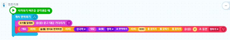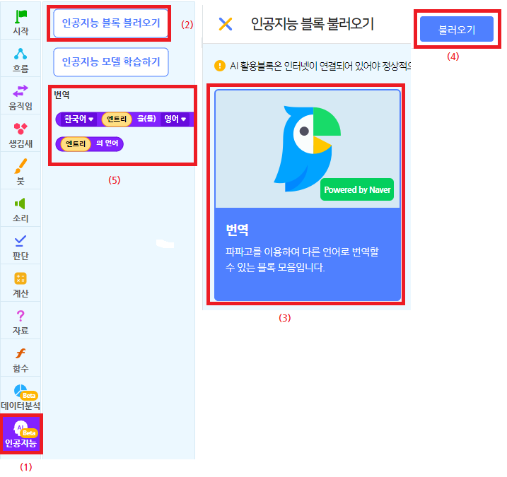 인공지능 ->인공지능블록 불러오기 -> 번역 선택 -> 불러오기 를 하면 (5) 와 같은 번역 블록이 생성됩니다.