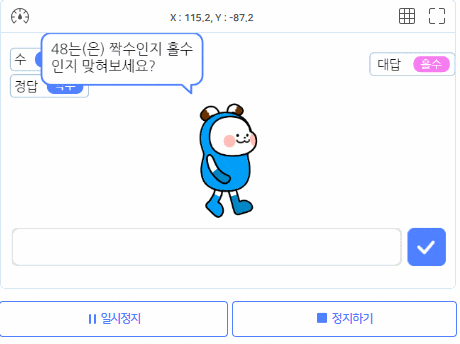 처음시작하면 엔트리봇이 어떤 수를 생각하고 그 수가 짝수인지 홀수인지를 묻습니다.