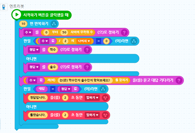 - 엔트리봇이 임의의 수는 짝수인지 홀수인지 맞혀 보세요? 라고 질문을 하고 답변을 기다립니다.
