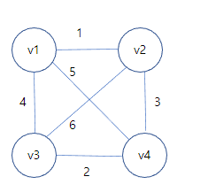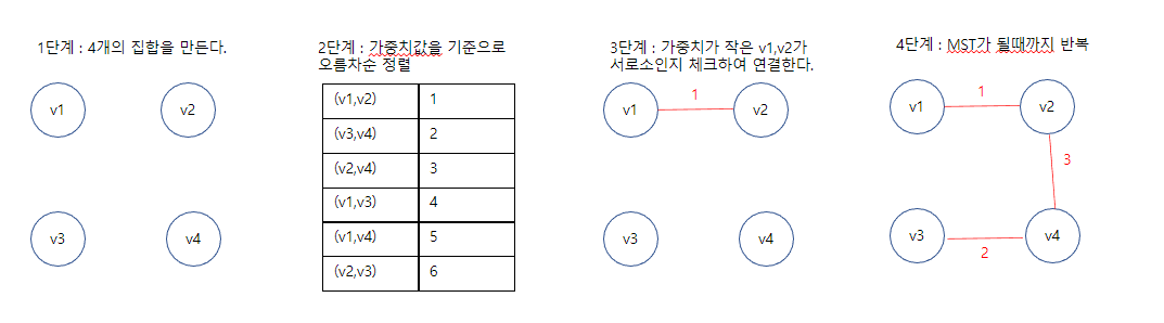 4개의 집합을 만든 다음 간선의 가중치를 기준으로 정렬해서 작은 것 부터 찾아서 연결 합니다. 1,2,3 을 연결 한 다음 v1과 v3을 가져 왔으면 두개의 노드는 같은 집합이므로 제외 하고 나머지 역시 제외 됩니다.