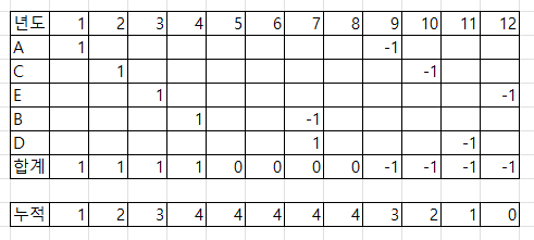 이렇게 누적 값을 이용하면 4~8년 사이에 4명의 과학자가 살아 있는 것을 알 수 있다.