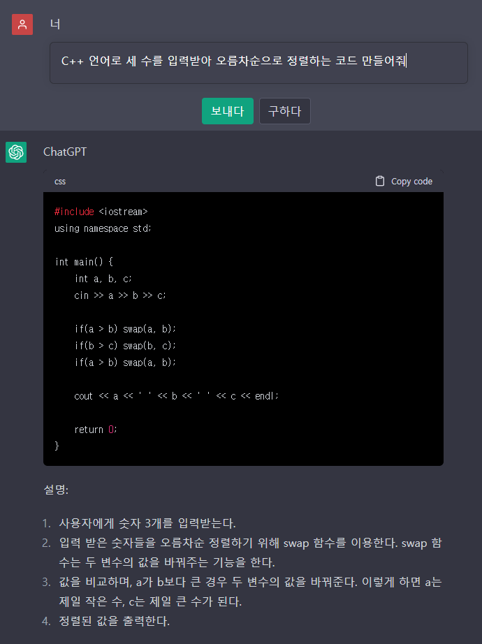 세 수를 입력 받아서 순서대로 정렬해서 출력하는 프로그램 구현을 하라고 하니 한참 고민하다가 잘 생각이 안나는지 "쌤 ChatGPT에 물어 보면 코딩 해 줄것 같은데요~" 라고 합니다.