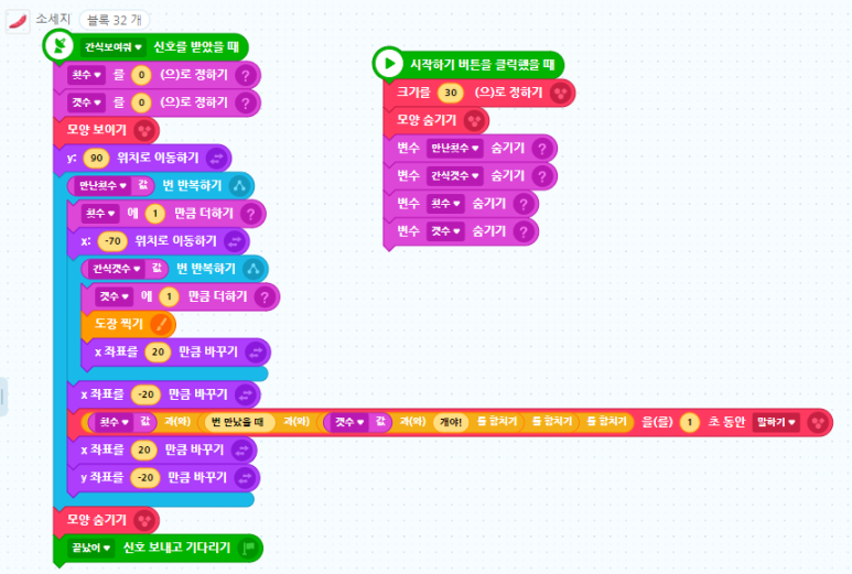 6. 엔트리봇이 "간식갯수 를 만난횟수 번 터피에게 간식을 주면 모두 ㅁ 개를 주었어!" 라고 2초간 말합니다.