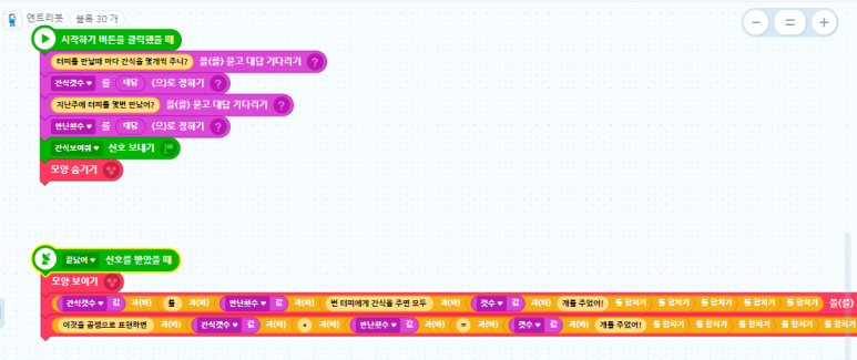 1. 엔트리봇이 처음에 나와서 "터피를 만날때 마다 간식을 몇개씩 주니?" 라고 묻고 기다립니다.