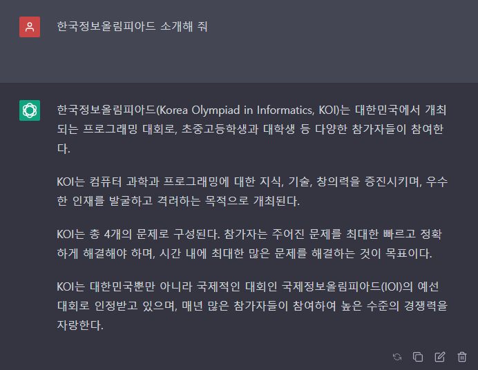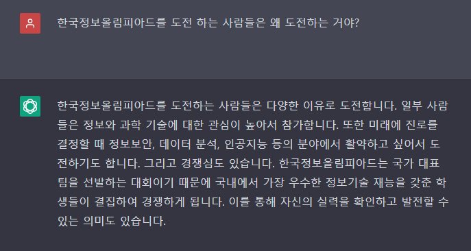 요즘 chat GPT를 활용해 보니 너무 편리해서 오늘도 chat GPT에게 한국정보올림피아드에 대해 물어 보았습니다.