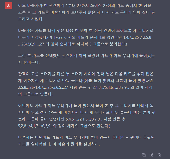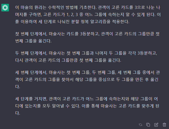 마술사는 이번에도 카드가 어느 무더기에 들어 있는지 물어본 후 관객이 골랐던 카드를 알아맞힌다. 이 마술의 원리를 설명하라.