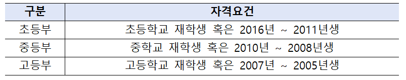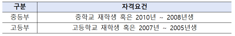 지도교사 : 교육부에서 인정한 정교사1급 혹은 2급 자격소지자 , 참가 신청일 기준,시도 교육청 소속학교 방과후 학교 교사로 재직중인 자