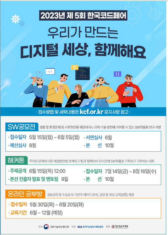 - SW 공모전 : 생활 및 환경 문제 등 사회현안을 해결하거나 과학.기술 발전에 기여할 수 있는 SW 작품을 연구.개발