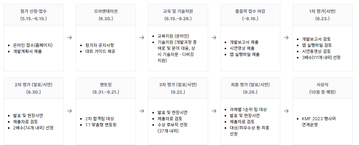 5월 15일 부터 6월 15일까지 참가신청을 받은 후 6월 15일 부터 9월 26일까지 교육 및 기술지원을 받습니다.