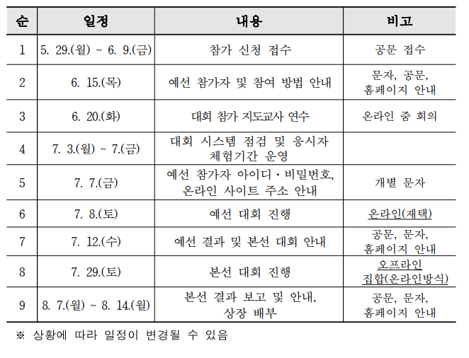 ◦ (일시 및 운영 방법) 온라인 예선, 오프라인 본선 대회 운영