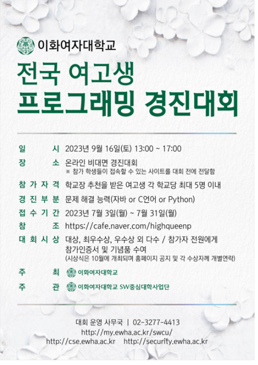 이화여대에서 주최하는 전국 여고생 프로그램 경진대회 소식이 있어 안내 드립니다.