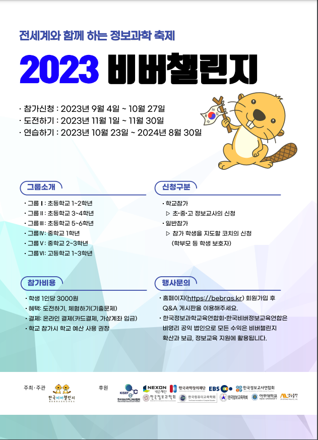 비버챌린지는 정보과학(정보, SW) 및 컴퓨팅사고력을 가르치는 국제행사입니다.