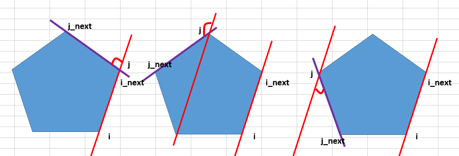 기준점이 되는 한변을 선택 한다면(i와 i_next) 위와 같이 다른 선분을(j와 j_next)를 진행 하면서 위의 j와 j_next 부분에서는 멈추면 된다는 것을 알 수 있다.