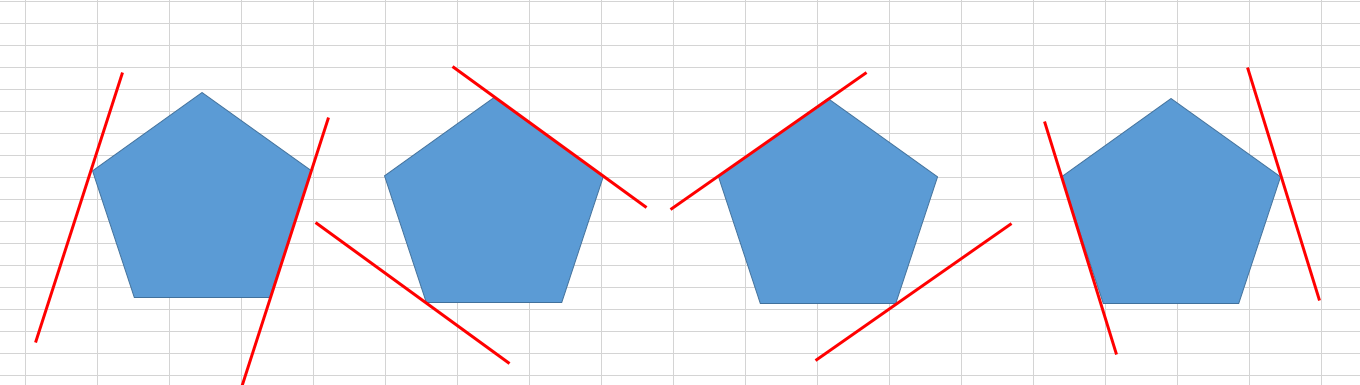 다각형을 따라 두 직선을 한바퀴 돌리면서 두 직선에 닿는 꼭지점들 간의 거리를 구하는 알고리즘이다.