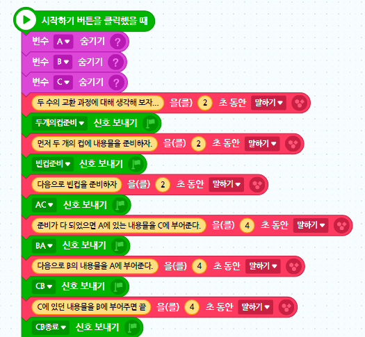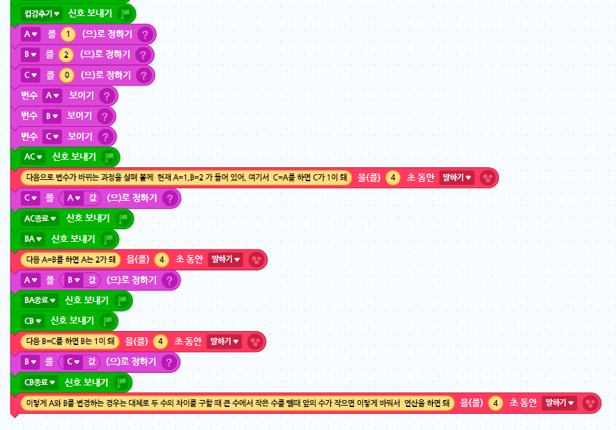 A,B,C를 각각 1,2,0 으로 정한 다음 변수 보이기를 해서 변수가 바뀌는 과정을 보여 주자.