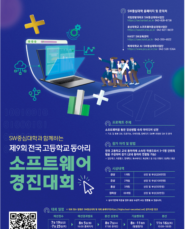 『SW중심대학과 함께하는 전국 고등학교 동아리 소프트웨어 경진대회』는 고등학생들의 소프트웨어를 통한 창의적 문제 해결 능력 및 협업 능력을 경연하는 축제의 장입니다. 고등학교 SW동아리 활성화 및 소프트웨어 인재 육성을 위해 SW중심대학(국립한밭대학교, 충남대학교, 한국과학기술원(이하 KAIST), 배재대학교)가 공동 개최하는 본 대회에 전국 고등학교 학생들의 많은 관심과 참여를 바랍니다.
