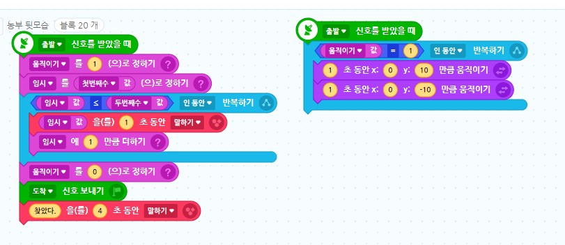 출발 신호를 받으면 첫번째 수부터 두번째 수까지 하나씩 증가하면서 말하기를 하면서 위 아래로 움직임