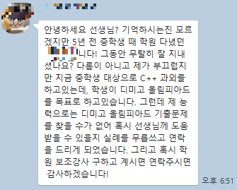 지난 주에는 초등학교 5학년때 우리 원에서 알고리즘을 배웠던 손*진 학생 어머니께서 도움을 많이 받았다고 연락을 주셔서 얼마나 고마웠는지 모르겠네요.^^