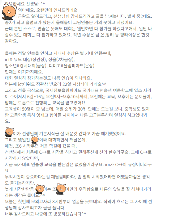 비밀글로 남겨 주셨는데 제가 학생 이름만 가리고 오픈을 하게 된 이유는 처음 시작을 C++로 시작한 것이 많이 도움이 되었다는 글이 있어서 혹시라도 처음 프로그래밍 언어를 시작하시는 분들이 어떤 언어로 시작하는 게 좋을지 고민 중이시라면 도움이 되실 것 같아서 이렇게 캡처해서 올리게 되었습니다.^^