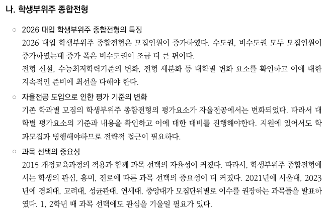 2026학년도 대입전형의 학종 의 특징을 살펴 보면 자율전공 도입으로 인한 평가 기준의 변화가 생겼다고 합니다.